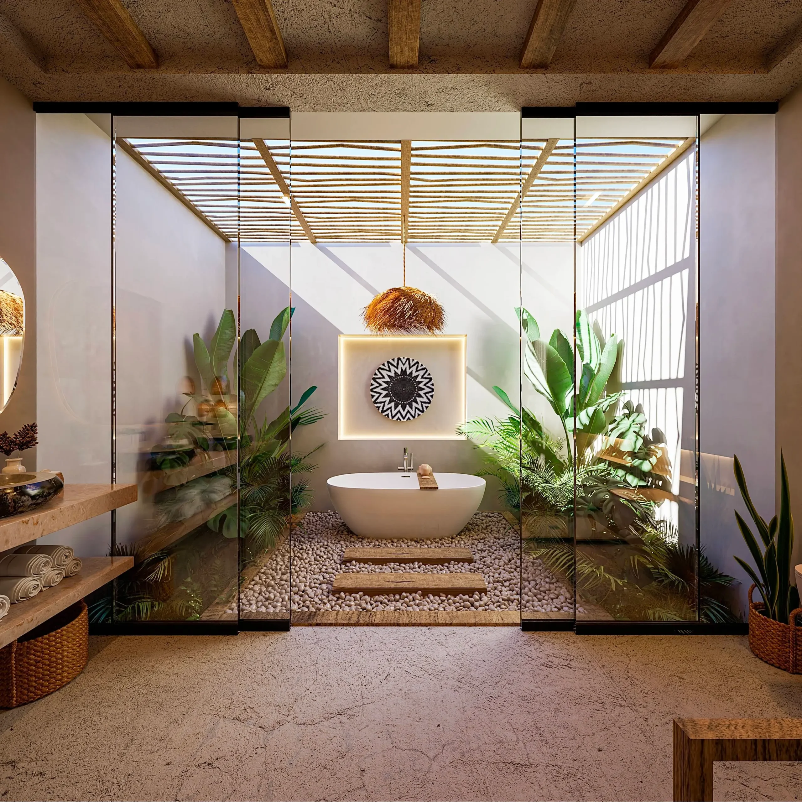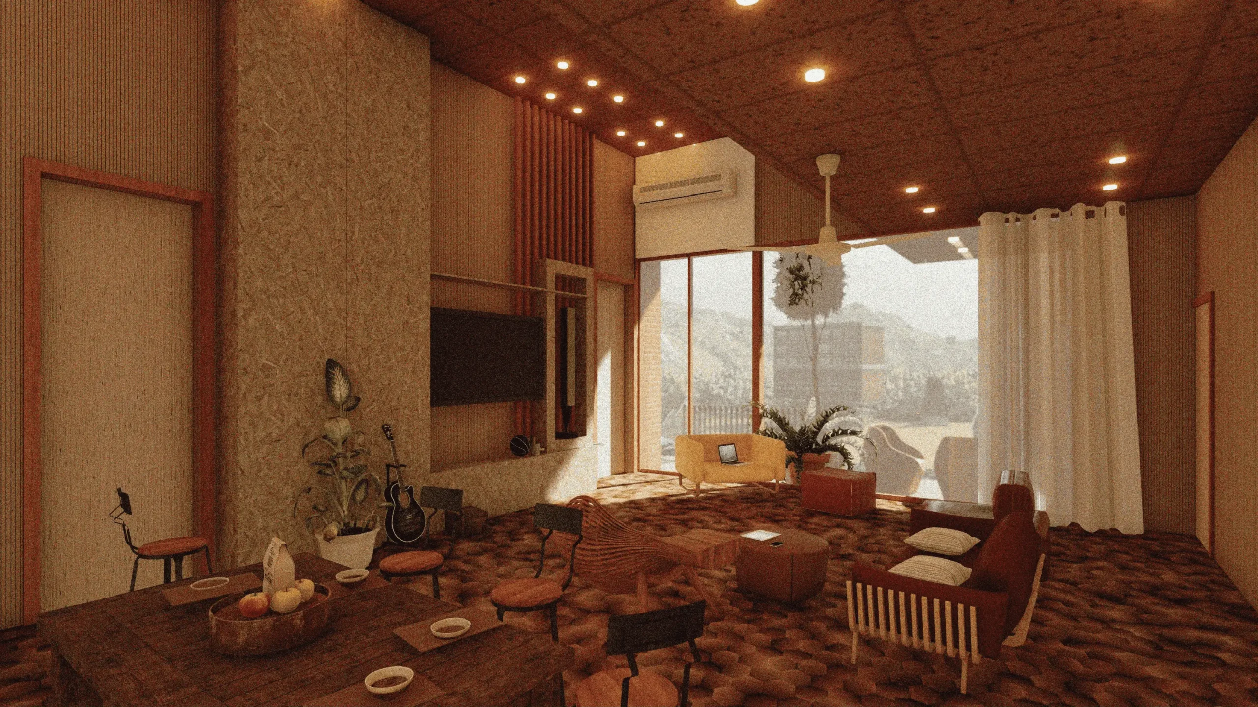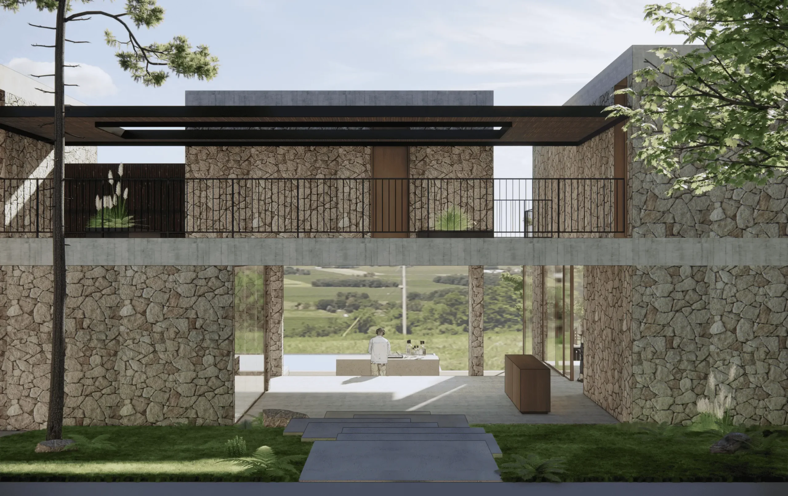 furnishings, surrounded by lush green spaces and